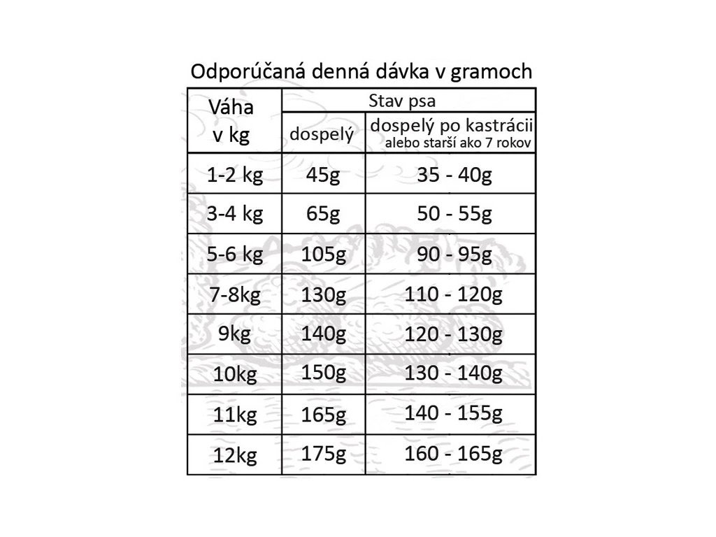 Pokyny: krmivo Fresh Farm Adult &Light Salmon &Rice je kompletné krmivo s obsahom všetkých živín potrebných pre zdravý a dlhý život Vášho psa. Nezabudnite však zabezpečiť neustály prístup k čistej čerstvej vode. Odporúčané dávkovanie môžete vidieť v tabuľke vpravo. Pri zmene krmiva odporúčame postupný prechod minimálne počas doby 2 týždňov tak, aby si organizmus psa zvykol na zmenu. Skladujte na suchom a chladnom mieste.