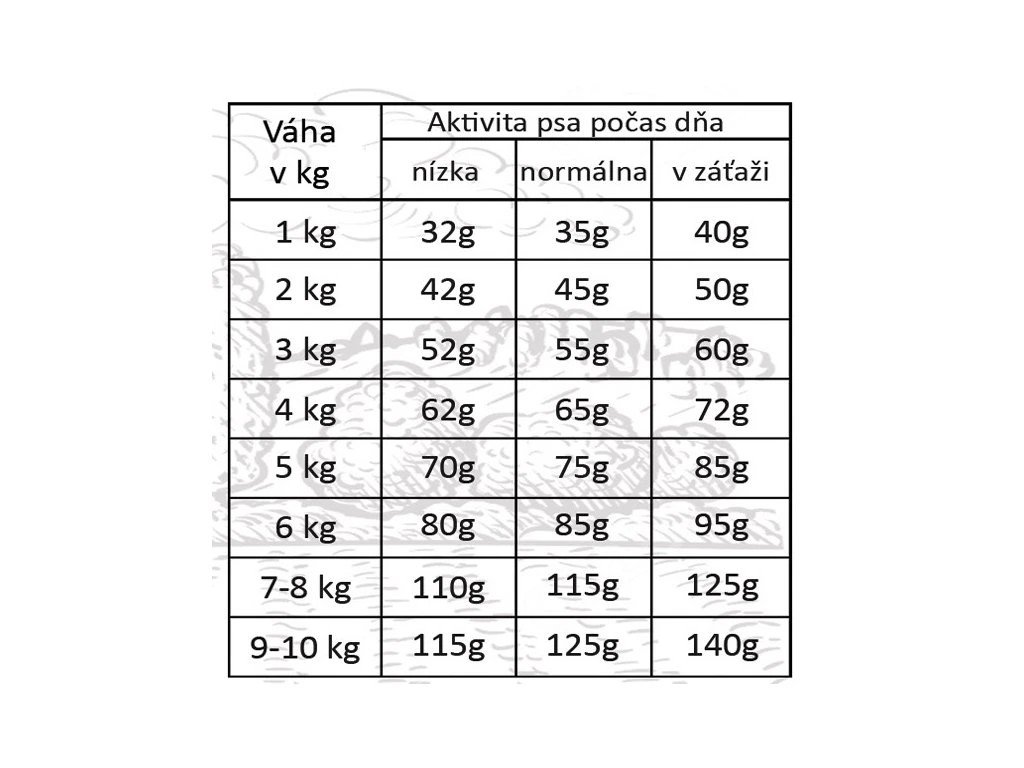 Pokyny: krmivo Ani - pet Fresh Farm GF Natural Dog Food Adult Mini - Venison & Sweet Potatoes je kompletné krmivo s obsahom všetkých živín potrebných pre zdravý a dlhý život Vášho psa. Nezabudnite však zabezpečiť neustály prístup k čistej čerstvej vode. Odporúčané dávkovanie môžete vidieť v tabuľke vpravo. Pri zmene krmiva odporúčame postupný prechod minimálne počas doby 2 týždňov tak, aby si organizmus psa zvykol na zmenu. Skladujte na suchom a chladnom mieste.