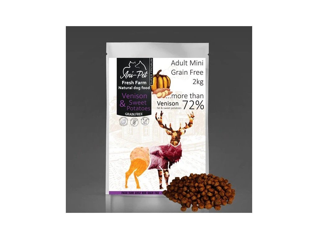 Ani - pet Fresh Farm GF Natural Dog Food Adult Mini - Venison & Sweet Potatoes je kompletné bezobilninové krmivo slovenskej receptúry pre dospelých psov. Určené pre malé plemená psov do 10kg s obsahom jelenieho mäsa a sladkých zemiakov. Jediný druh živočíšnej bielkoviny z jeleňa, vďaka čomu je toto krmivo mimoriadne vhodné pre psov s intoleranciou na iné druhy živočíšnych bielkovín. Rastlinné zložky v podobe sladkých zemiakov, zemiakov a zeleniny predchádzajú najčastejším prejavom potravinovej intolerancie u zvierat. Doplnené o výťažky z gaštanov, čakanky a cholin chlorid na zlepšenie činnosti tráviaceho ústrojenstva. Ľanové semienka pôsobia priaznivo na kvalitu a zdravie pokožky a srsti. Krmivo bez použitia pridaných farbív, dochucovadiel a chemických konzervantov.
