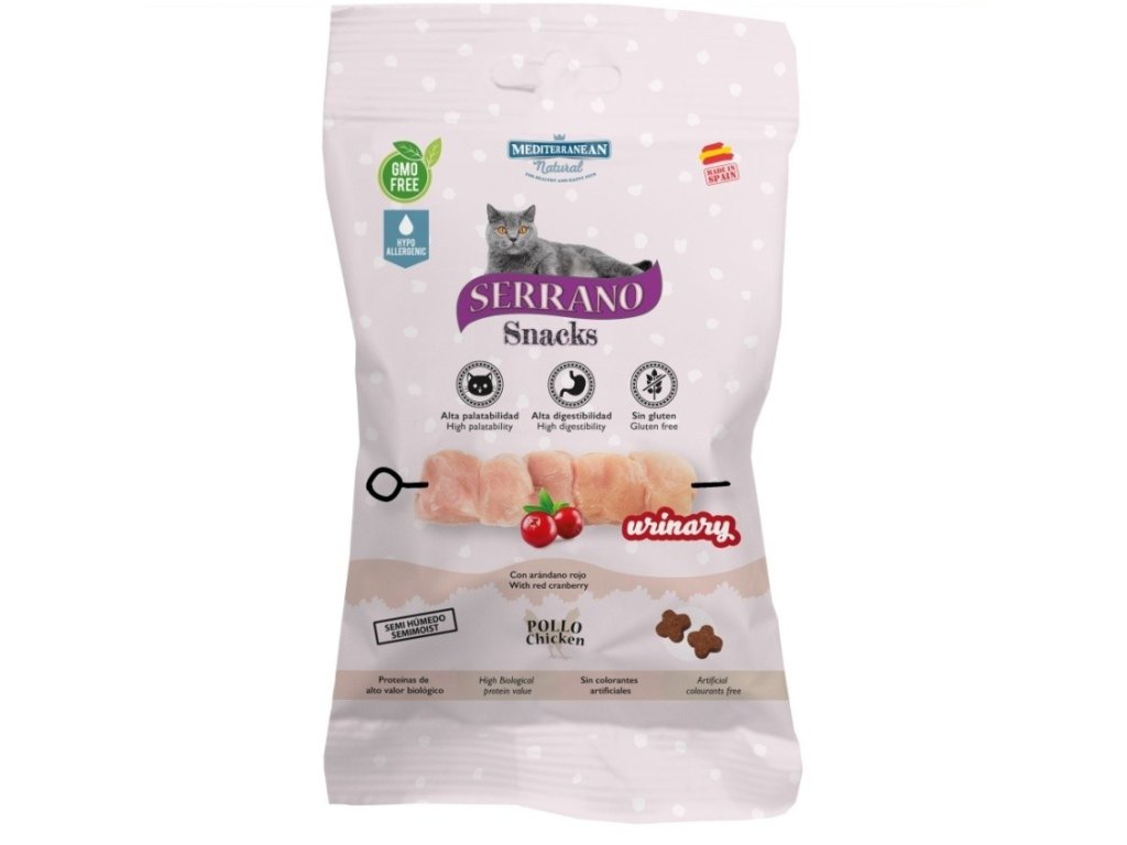 Hypoalergénne Serrano snacks mačacie močové kuracie maškrty obsahujúce brusnice, ktoré pomáhajú predchádzať zápalom a podporujú zdravie močových ciest.